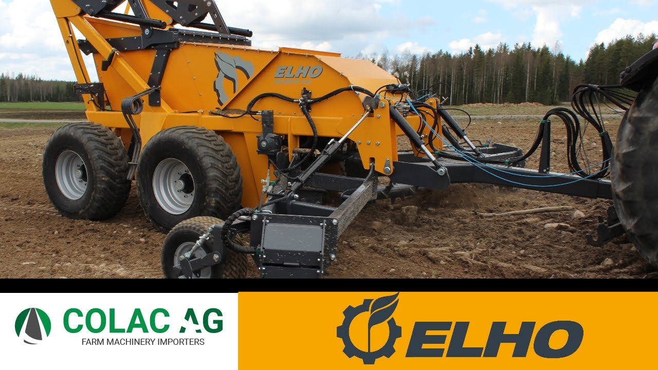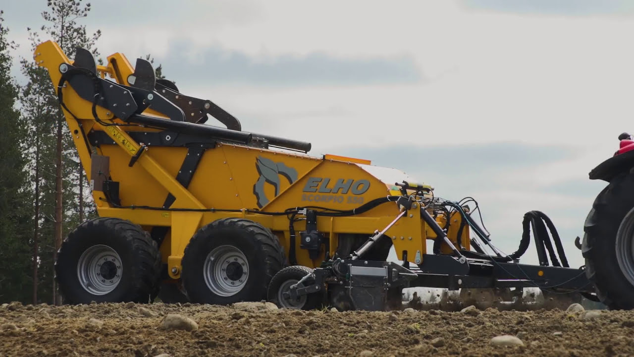Scorpio is designed and manufactured on the west coast of Finland where the inland ice left large amounts of rocks and stones of all sizes some thousands of years ago. Our ancestors have fought with stones for centuries and we are still fighting! So in Finland we know stones! Stones in the field cause huge costs every year when harvesting machines brakes down because of them! And you can’t only calculate the harvesting machine repair cost, there is also a lot of lost working hours. Harvesting can easily be delayed up to a week or more, depending on what has broken down on the machine. Loss of working hours is a reduction of income! To help the situation, ELHO Scorpio 550 the totally hydraulic driven stone collector was born. Picking stones efficiently, well working sift, a large working width and durability of the machine has been the main goals when creating the Scorpio. The machine is equipped, to mention some, with hydraulic drive and this patented hydraulic system directs the power to where the demand is greatest. The pick-up rotor or tines does not break down even if it gets totally blocked. The reverse function can easily clear up blockage and there is no need to go out of the tractor. The large and durable lifting tines are flexible in all directions. Every steel bar in the sieve is replaceable and every other sieve steel bar can be removed to create a larger gap between the bars, the distance between the sieve bars is 40-110 mm. The sieve bars are resilient and every other of the bars is mounted at different height to prevent wedging. The wide side rake tines are made of Hardox steel and are firmly welded on to the rotor tube. The rotor bearings are built into the steel tube which gives high durability and good protection. The side rakes can also be reversed to remove blockage. The rake rotor is mounted far from its frame to prevent wedging between the rake rotor and the frame structure. Scorpio has a large hopper, with a tipping height of 2,7 meters, this way it can easily reach over the sides of a big trailer. The back wall of the hopper also sifts out soil when tipping the load. The side plates and the hopper lid plate are made of Hardox steel. Scorpio has a sturdy steel frame, telescopic drawbar with overload protection, wide rakes, large tandem wheels and all functions on the machine is hydraulically driven. No belts or chains to change! The ELHO Scorpio has an automatic depth adjustment. The machine follows the ground actively. Working depth adjustment has two depth settings that can be manually overridden by the driver's commands. With the automatic depth adjustment the driver doesn’t need to keep track of how deep the machine goes, this helps a lot on very uneven field or in poor visibility. The ELHO Scorpio work area is not only the removal of stones from the farm fields but also, for example roads, other type of fields, renovations and construction of green areas. Scorpio 550 is very suitable for contracting. No belts, no shafts, no stones, no problems - that is the Scorpio!